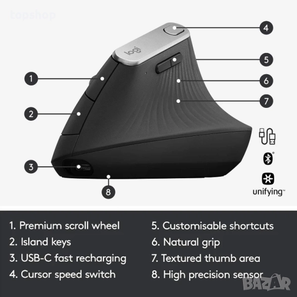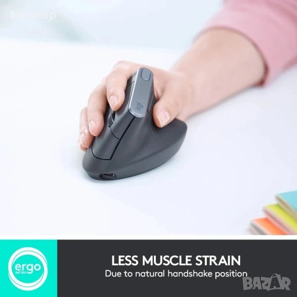 MX Vertical е усъвършенствана ергономична мишка, която съчетава научно обоснован дизайн с повишената производителност на серията Logitech MX. Естествената позиция на ръкостискане на MX Vertical е проектирана да намали натиска върху китката и напрежението на предмишницата, свързани с травми от повтарящо се натоварване (RSI) и синдром на карпалния тунел (CTS).* Уникалният вертикален ъгъл от 57° е оптимизиран за ергономична стойка, без да се прави компромис с производителността. MX Vertical разполага с високопрецизен сензор с 4000 dpi, което води до 4 пъти по-малко движение на ръката1 и намаляване на умората.** А превключвателят за скорост на курсора ви позволява незабавно да регулирате скоростта и точността на dpi с едно натискане на бутон. MX vertical издържа до четири месеца с пълно зареждане – и осигурява три часа употреба с едноминутно бързо зареждане.*** (*в сравнение с традиционна невертикална мишка. **в сравнение с традиционна мишка със сензор 1000 dpi. Животът на батерията може да варира в зависимост от потребителя и условията на работа.) Bluetooth подробности: Bluetooth технология с ниска консумация на енергия, Windows 10 или по-нова версия, macOS 10.15 или по-нова версия, iPadOS 13.4 или по-нова версия, Chrome OS 9 и Linux 10. Безжично работно разстояние 10 м.