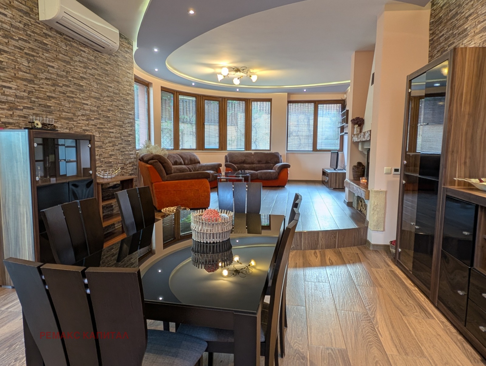 - Първи етаж просторна дневна с камина Seguin, кухня с електроуреди Bosch и трапезария, стая за гости, баня, техническо и складово помещение, директен излаз към тераса и зимна градина с външна кухня и барбекю.