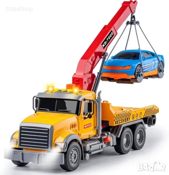 Голям камион за вдигане на коли. Колата е включена. Камион с кука и кола за момчета.