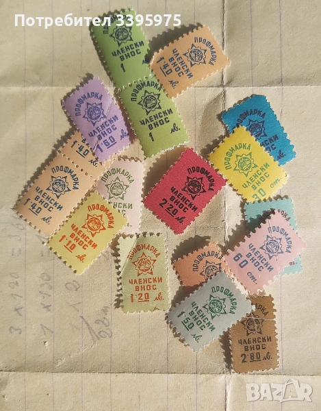 Комплектът включва автентични синдикални печати (членски внос) с различни номинали и цветове, използвани през този период.