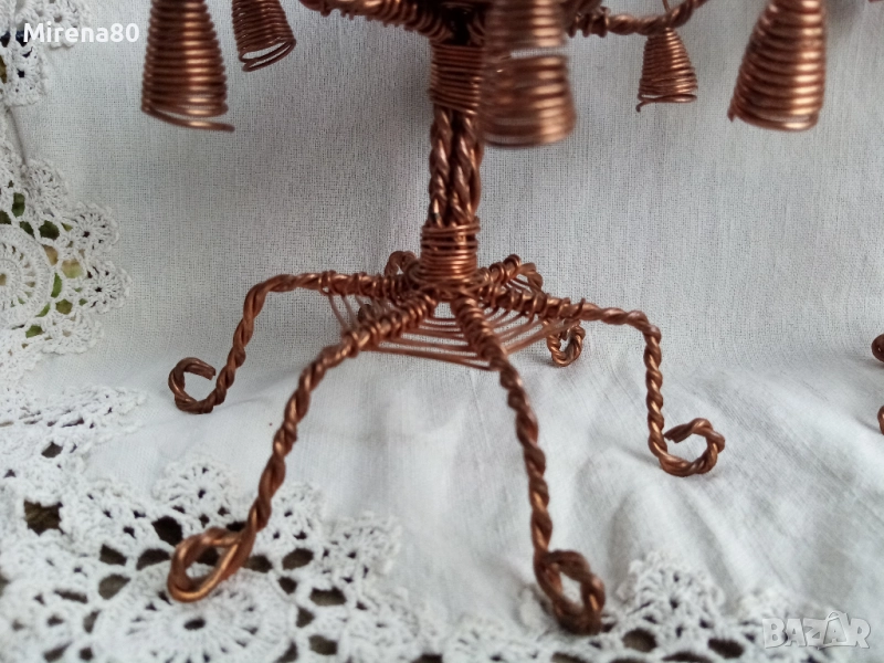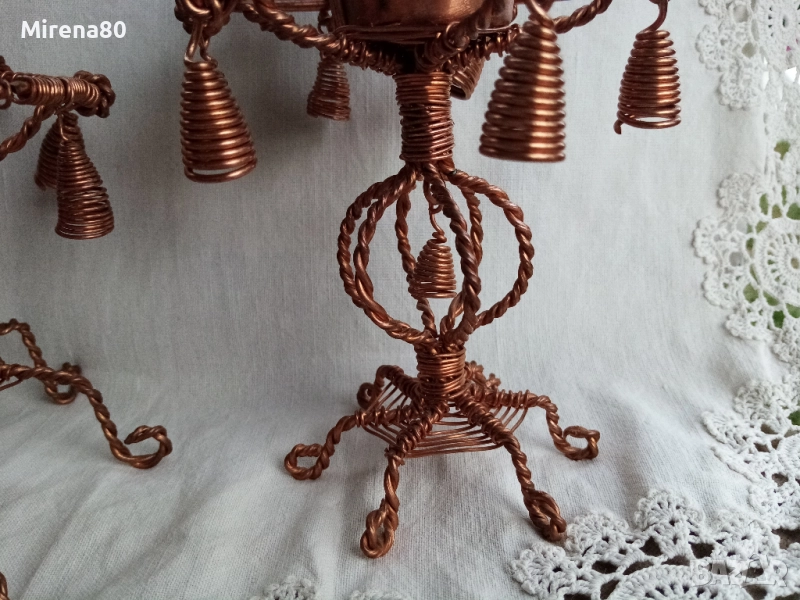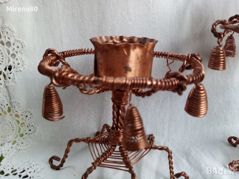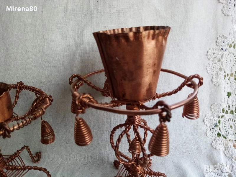 Много интересни и ефектни свещници, изработени от мед и медна тел. Високият е 18 см височина, 6 см - диаметър на гнездото. Ниският е 12 см, 5 см - гнездо. Отлично състояние !