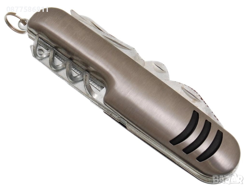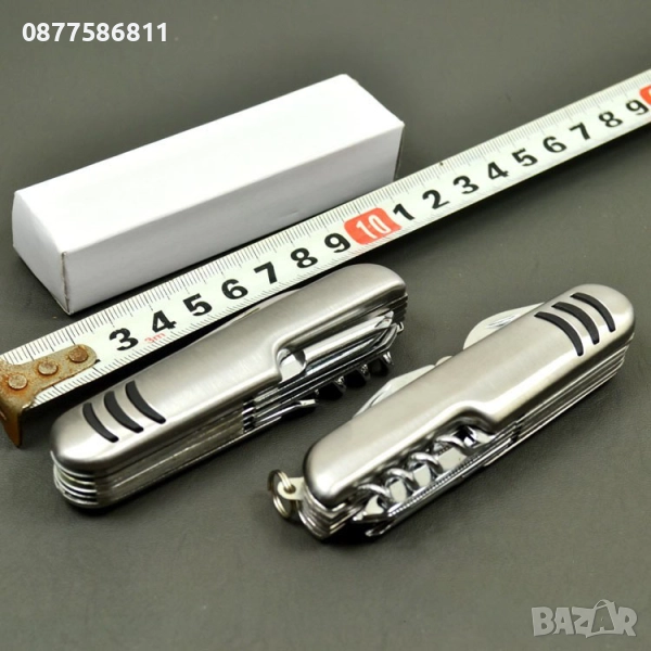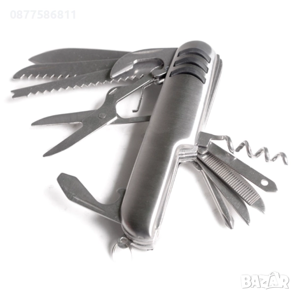 Многофункционалният инструмент съдържа: нож, отварачки за консерви, за бутилки, трион, резач за риба, тирбушон, отвертка, комплект за нокти,