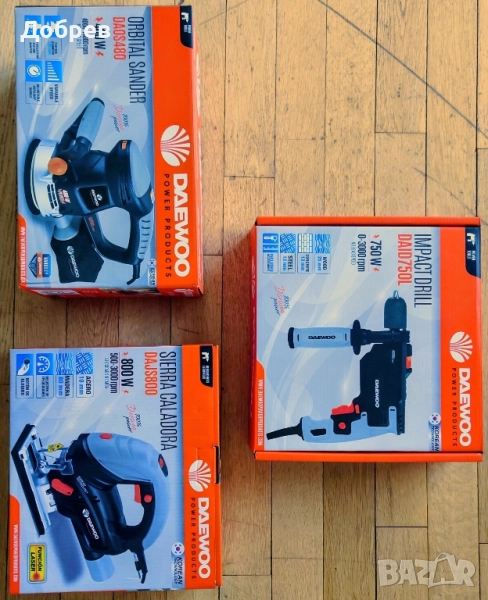 Daewoo сет от 3 уреда, малко ползвани: ексцентрик шлайф, прободен трион, бормашина 750 вата и