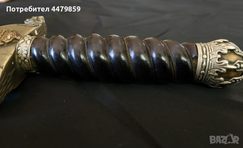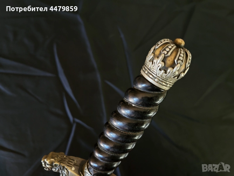 Дръжката се стяга в края от царска корона изработена от две части ,сребърна корона вътрешно запълнена с бронзова главина.
