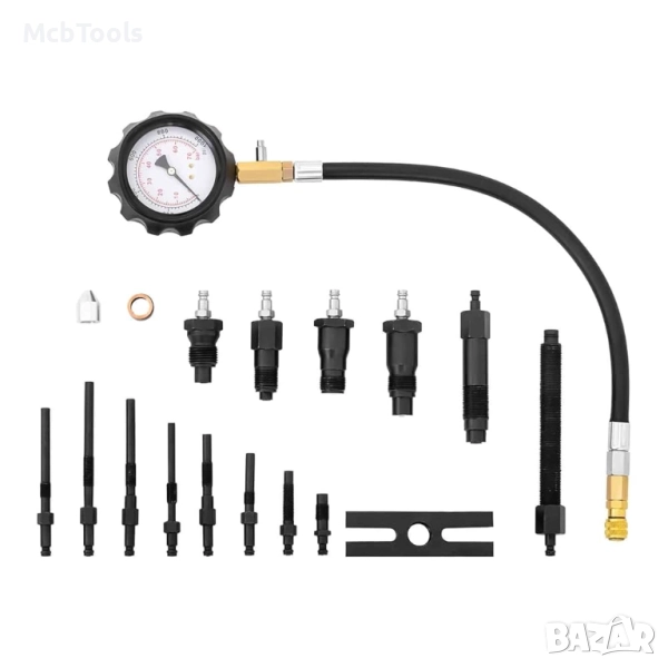 С уреда лесно се откриват проблеми като износени клапани, бутални пръстени, водачи, уплътнения и цилиндрова глава. Манометърът с двойна скала ( 0 – 1000 psi / 0 – 70 bar ) и система за бързо освобождаване гарантират удобство, сигурност и професионални резултати при всяка проверка.