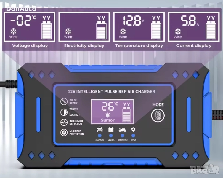 Интелигентното зарядно за акумулатори 12V 6A е практично решение за бързо и безопасно зареждане на автомобилни и мотоциклетни батерии. С LCD дисплей за лесно наблюдение на процеса и функция за Smart Repair, устройството не само зарежда, но и подпомага възстановяването на изтощени акумулатори.