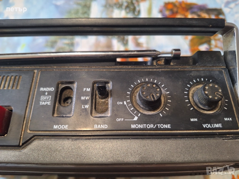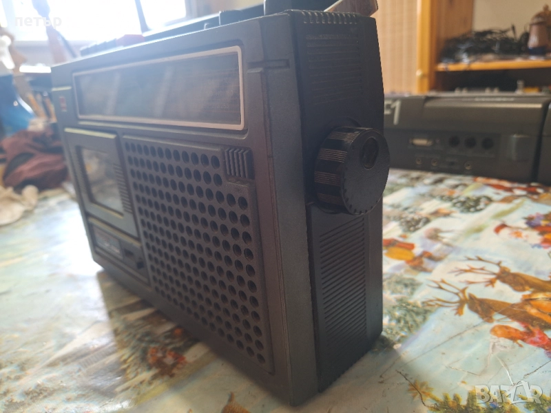 Касетофона има забележки. Радиото работи, касета върти и превърта,но няма звук.Липсва един превключвател.Козметични забележки. За донор или възстановяване. Лично предаване.