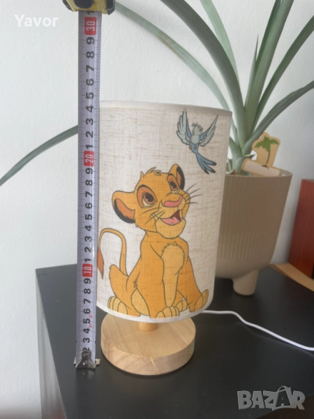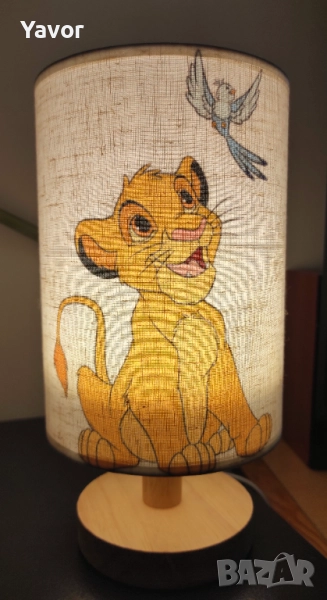 Красива нощна лампа с мотив от Цар Лъв. Дървена основа и абажур с изображение на Симба. Подходяща за детска стая или за декорация на дома. Идеална за създаване на топла и уютна атмосфера. Не е необходима крушка.