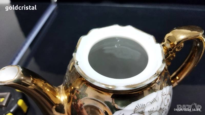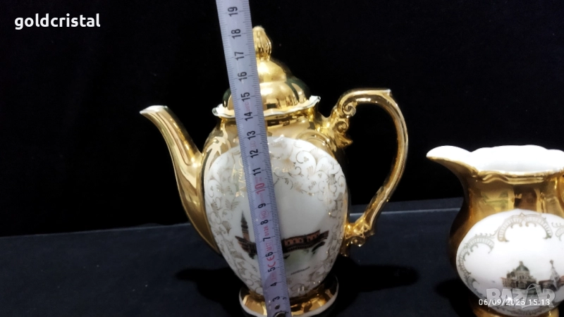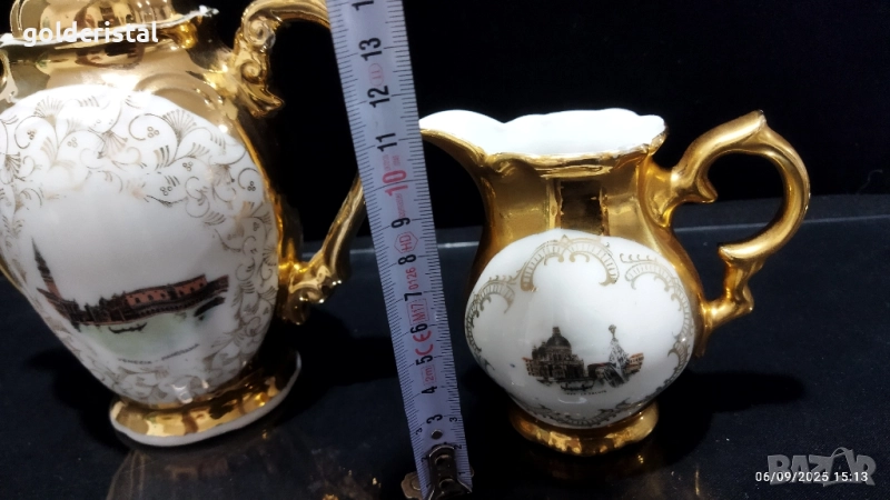 старинен немски порцелан чайник и каничка с много позлата с следи от времето без чукнато и пукнато сервиз комплект сет лот ретро арт декор винтидж колекция стари старинни антикварни предмети обзавеждане за дома и семейството подходящи за подарък за ценители и колекционери