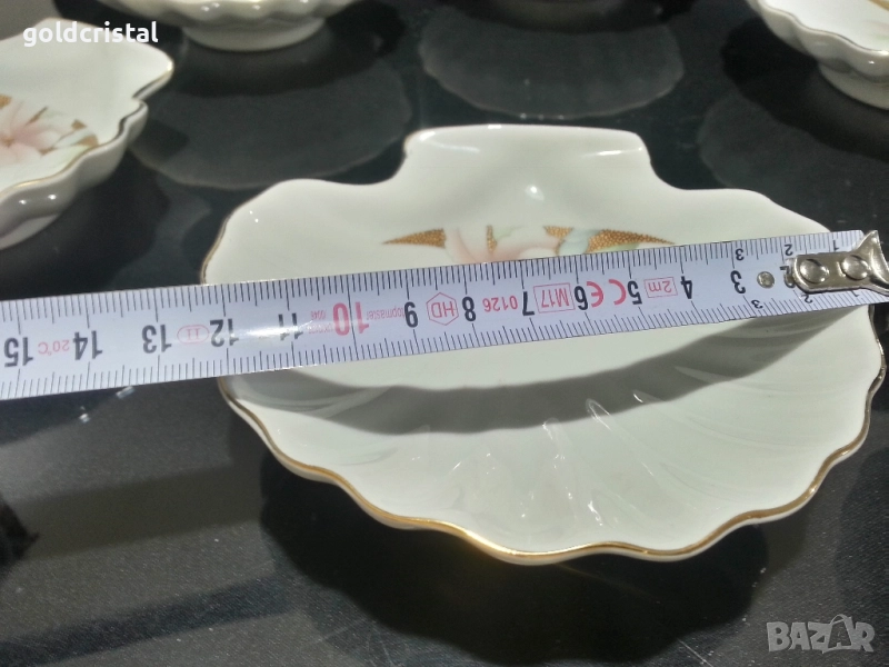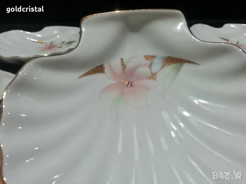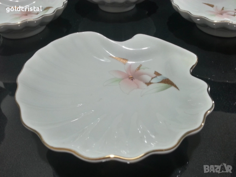 Стар български порцелан Изида чинии купички с форма на миди златен кант без забележки сервиз комплект сет лот ретро арт декор винтидж колекция стари старинни антикварни предмети обзавеждане за дома и семейството подходящи за подарък за ценители и колекционери