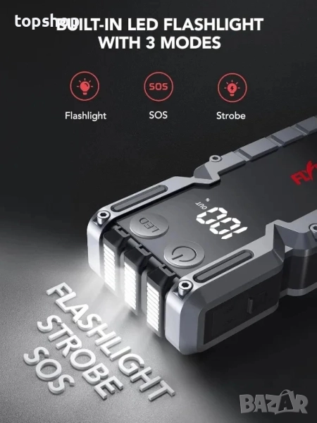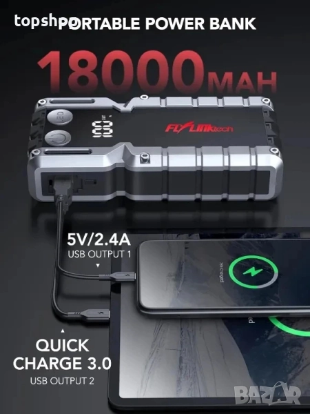 ?Многофункционален - Не само е стартер за кола, но и захранваща батерия и LED фенерче. Капацитет на батерията 18000mAh с 2 USB изхода (5V/3A и 5V/2.4A), портът за бързо зареждане 3.0 може да зареди напълно вашите телефони, таблети и други USB устройства за зареждане. Вградена LED светлина с 3 режима (LED фенерче, стробоскоп, SOS), подходяща за шофиране на дълги разстояния, приключения, дейности на открито, спешни случаи, пътуване и др. ?Преносим дизайн и водоустойчивост IP67 - Аварийният преносим стартер за кола е с компактен и лек дизайн, тежащ само 0,8 паунда (0,36 кг). Здрав, водоустойчив корпус със защита IP67, изработен от ABS, за да се предотврати надраскване или повреждане на повърхностите. Оборудван с голям LED дисплей, който ясно показва работното състояние на продукта.