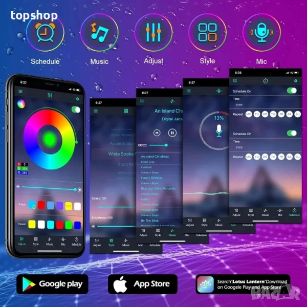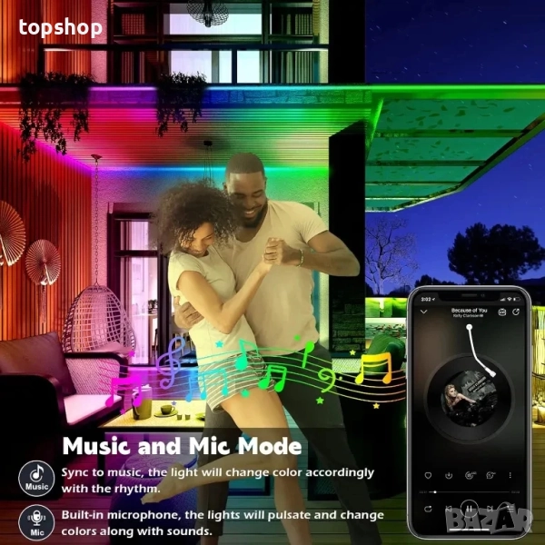【Синхронизиране на музиката с LED ленти】Приложението възпроизвежда любимата ви музика, а цветовете на външните LED ленти се синхронизират с музиката. Идеална декорация за всякакви празници и партита, като например декорации за рождени дни и коледни партита.