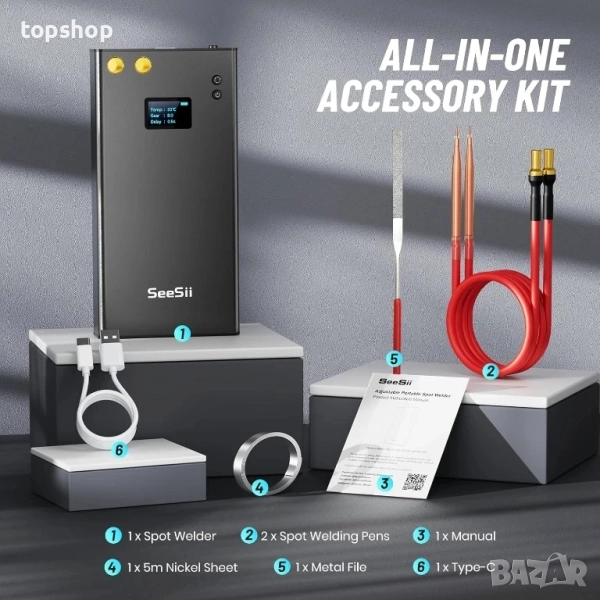 7500mAh акумулаторна батерия: Преносима точкова заваръчна машина Seesii с вградена високоскоростна батерия 7500mAh; Зарежда се напълно за 3 часа с Type-C кабел; Способна е да заварява хиляди точки с пълно зареждане; Също така, мини инструментът за заваряване може да зарежда вашия телефон.