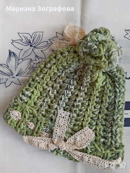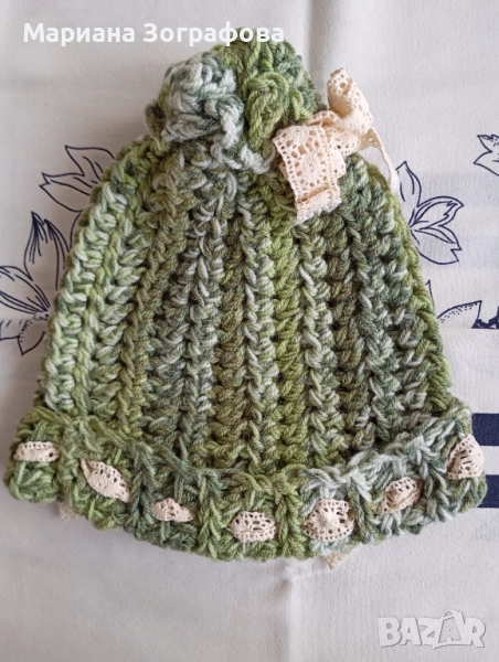 1. Шапка в пастелни нюанси на зелен меланж - с помпон, декорирана с дантелена памучна панделка в кремаво - 35.00 лв.