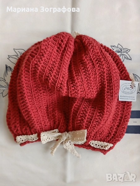 2. Бежова шапка, декорирана с панделка от керемидено-червен памучен плат и копче - 32.00 лв.