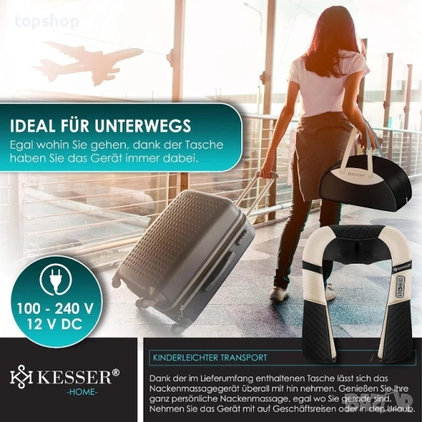 Гъвкава чанта за носене: благодарение на включената чанта за транспорт, масажорът за врата от KESSER може да бъде взет навсякъде. Насладете се на личния си масаж на врата след натоварен ден, независимо къде се намирате. Вземете масажора за врата със себе си на следващото си бизнес пътуване или почивка.
