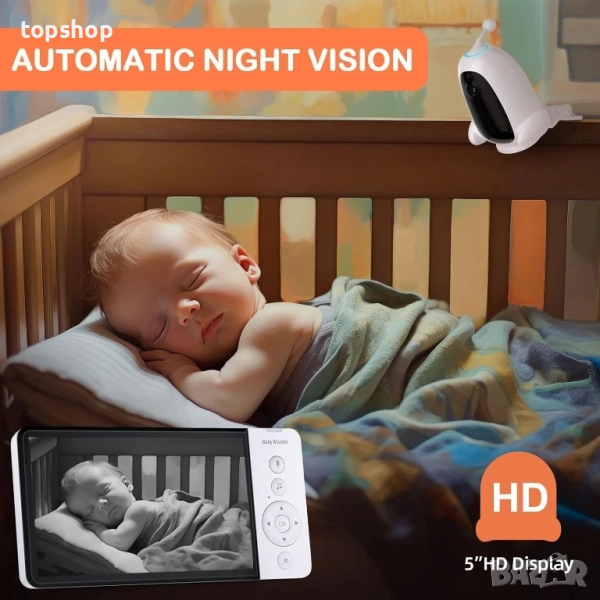 Бебефон без WiFi с 5” HD монитор, камера и аудио, сензор за стайна температура, автоматично нощно...