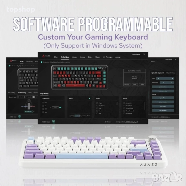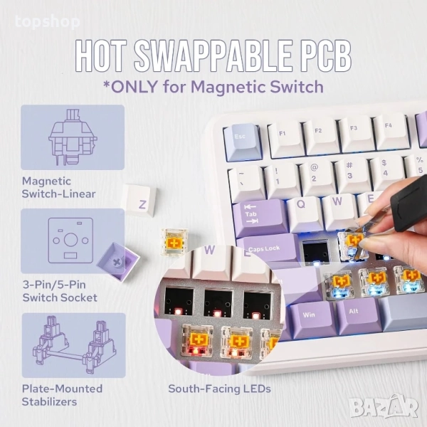【Подобрена с магнитен превключвател】 След успеха на AJAZZ AK820 Pro, AJAZZ представя подобрената AK820 MAX HE, включваща фабрично смазани магнитни превключватели. За разлика от традиционните механични превключватели, тези магнитни превключватели предлагат бързи възможности за задействане, което позволява ултра-бързо време за реакция. Потребителите могат да активират клавишите веднага след еднократното им натискане, без да чакат пълно нулиране. Клавиатурата поддържа различни режими на смяна на клавишите, включително DKS (Динамично превключване на клавиши), MT (Магнитно тактилно), TGL (Заключване на спусъка) и SOCD, което повишава нейната гъвкавост.