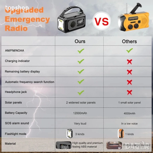 44400mWh/12000mAh аварийно радио, преносимо ръчно соларно радио AM/FM/NOAA метеорологично радио с 2 слънчеви панела, 3 метода на зареждане, SOS аларма, фенерче, зарядно за телефон, компас, лампа за четене