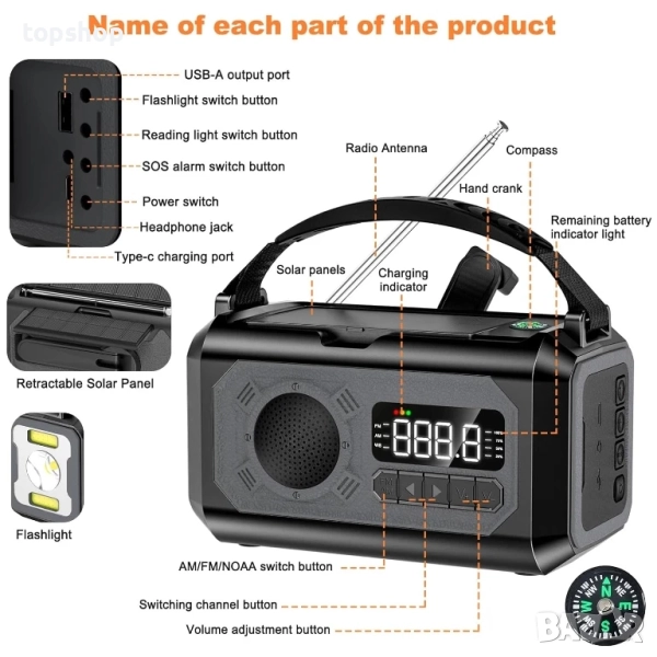 H17 Многофункционално аварийно радио, Пауър банка, компас, захранвано от слънчева енергия! Чисто ново!