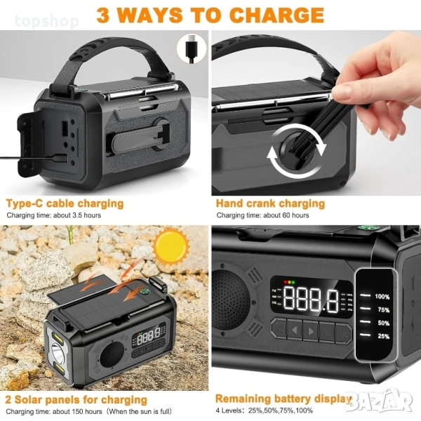 Ново 44400mWh/12000mAh аварийно радио, преносимо ръчно соларно радио AM/FM/NOAA