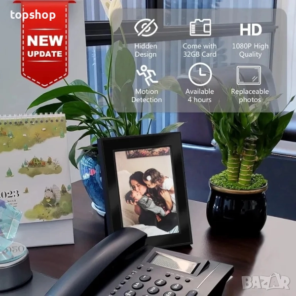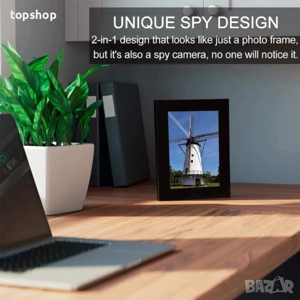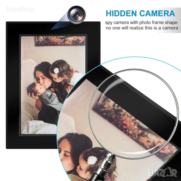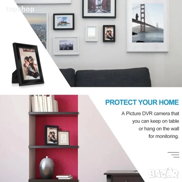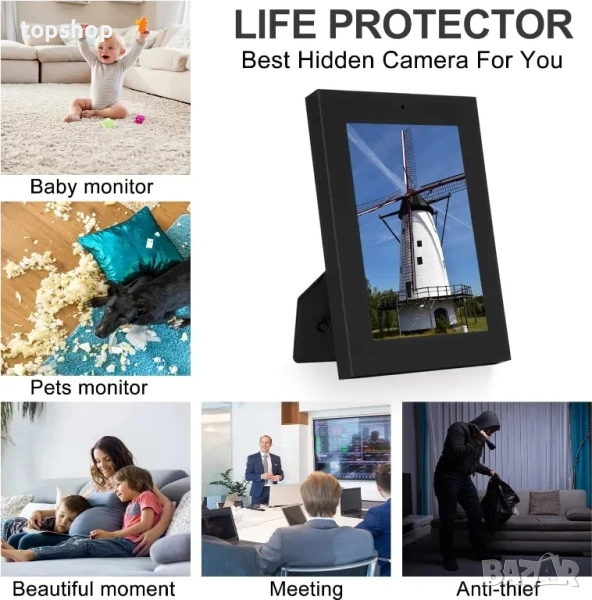 Перфектен за декорация. Уникален дизайн на рамка за снимки, която можете да поставите на бюра и рафтове или да я закачите на стената във вашия дом и офис. Многофункционалната камера с фото рамка е най-добрият избор за декорация и сигурност на дома/офиса