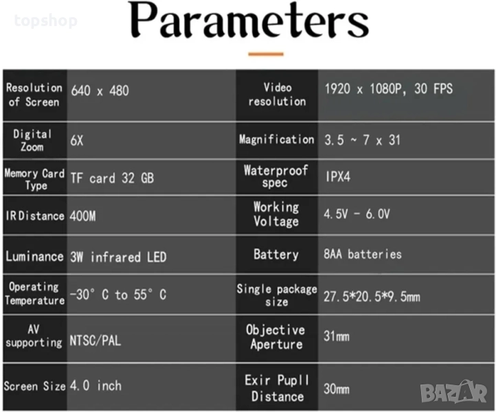 Голям 4-инчов LCD екран за стабилно изображение и видео показване дори с очила. Можете също така да записвате снимки и видеоклипове с очилата за нощно виждане. Можете не само да виждате вградения LCD екран, но и да го свържете към външно устройство за гледане.