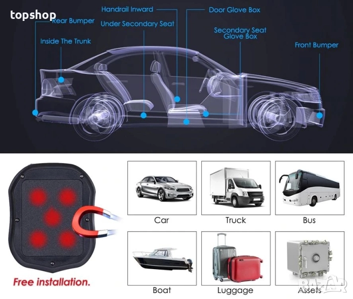 Този водоустойчив GPS тракер работи в мрежата Orange, Telekom, Vodafone и Lycamobile DIGI, може да локализира и наблюдава всяко отдалечено местоположение чрез SMS, мобилно ПРИЛОЖЕНИЕ и софтуер за уеб проследяване без ограничение на разстоянието за проследяване! Той използва най-модерната GPS и LBS технология за двойно позициониране. Освен това с вграден силен магнит се монтира много лесно и плътно върху колата, камиона и всякакви метални повърхности.
