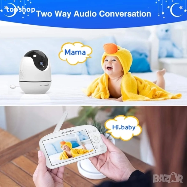 Нов бебефон Vili Nice с 720P HD голям 5.5" дисплей, автоматично нощно виждане, двупосочен разговор..