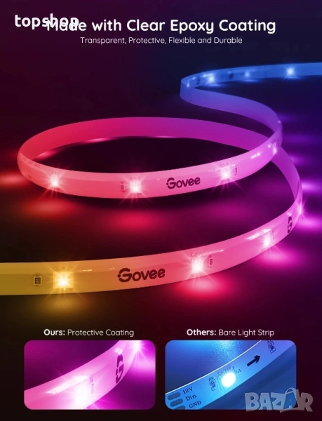 Защитно покритие: LED лентите са покрити със защитно покритие, което е изключително издръжливо и гъвкаво. То може да предпази интелигентните LED ленти от влага и прах и да покаже цветни светлинни ефекти.