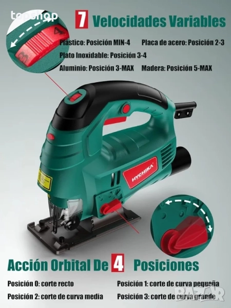 800 W мотор и 7 регулируеми настройки: прободният трион има мощен меден мотор с мощност 800 W, 7-скоростен регулатор и регулируема скорост от 800 до 3000 об/мин.