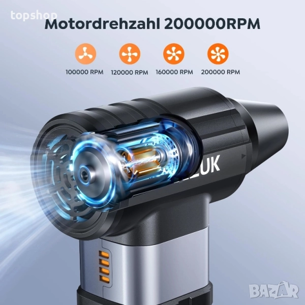 Батерия 10500 mAh с бързо зареждане тип C: батерията на духалката има вградена литиево-йонна батерия 10500 mAh, осигурява до 15 минути непрекъсната работа на пълна мощност и до 90 минути на ниска скорост. Бързото зареждане тип C позволява пълно зареждане само за 3,5 часа, със защита от прегряване и късо съединение за максимална безопасност.
