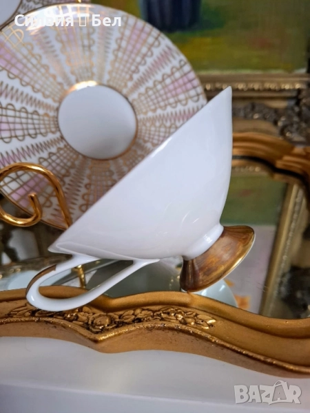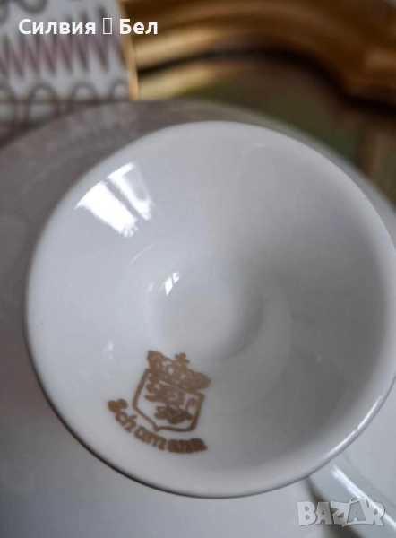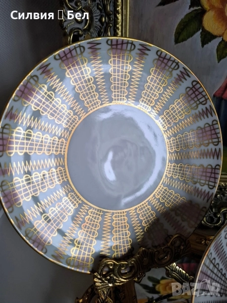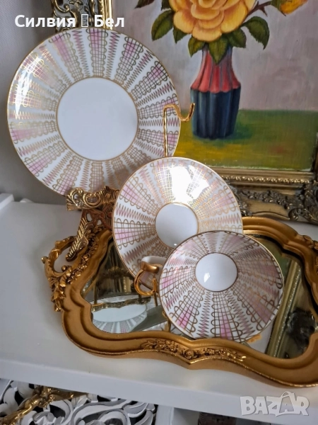 Елегантен и изискан, порцеланов комплект от три части-Schumann Bavaria Germany ⚜️Декорът е фин и сложен, със златисти геометрични елементи, съчетани с меки розови нюанси, които създават усещане за лукс и ретро шик. ⚜️ Златният кант и детайлите върху чашата и чинийките подчертават класическата изтънченост на марката Schumann Bavaria Germany – прочут немски производител на порцелан. ⚜️ Чаша с вместимост 150 мл. ⚜️ Две чинийки – за чай и десерт-15 и 19см. ⚜️ Богата златиста орнаментика с нежни розови нюанси. ⚜️ Маркировка на производителя.~50-те години... Порцеланът е в отлично състояние, без пукнатини и наранявания. Подходящ както за стилно поднасяне на чай или кафе, така и за колекционери на качествен европейски порцелан. Цена: 5️⃣5️⃣лв./28,12 € ೋ⚜️ ೋ⚜️ ೋ⚜️