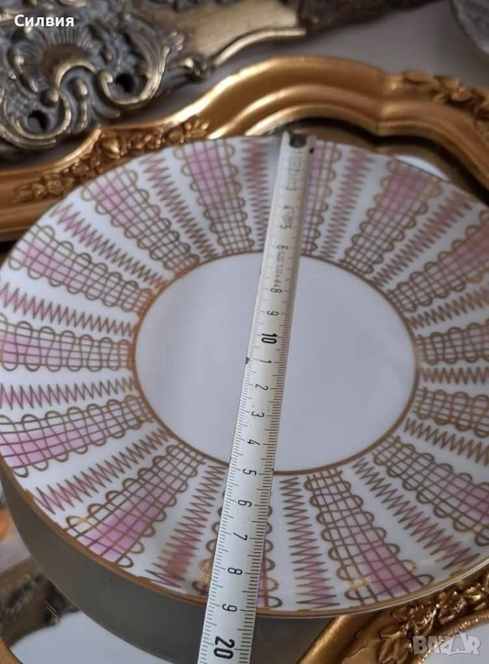 Елегантен и изискан, порцеланов комплект от три части-Schumann Bavaria Germany ⚜️Декорът е фин и сложен, със златисти геометрични елементи, съчетани с меки розови нюанси, които създават усещане за лукс и ретро шик. ⚜️ Златният кант и детайлите върху чашата и чинийките подчертават класическата изтънченост на марката Schumann Bavaria Germany – прочут немски производител на порцелан. ⚜️ Чаша с вместимост 150 мл. ⚜️ Две чинийки – за чай и десерт-15 и 19см. ⚜️ Богата златиста орнаментика с нежни розови нюанси. ⚜️ Маркировка на производителя.~50-те години... Порцеланът е в отлично състояние, без пукнатини и наранявания. Подходящ както за стилно поднасяне на чай или кафе, така и за колекционери на качествен европейски порцелан.ೋ⚜️ ೋ⚜️ ೋ⚜️