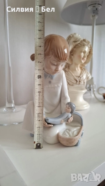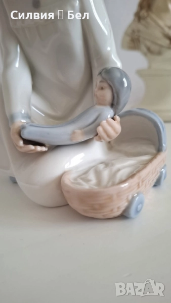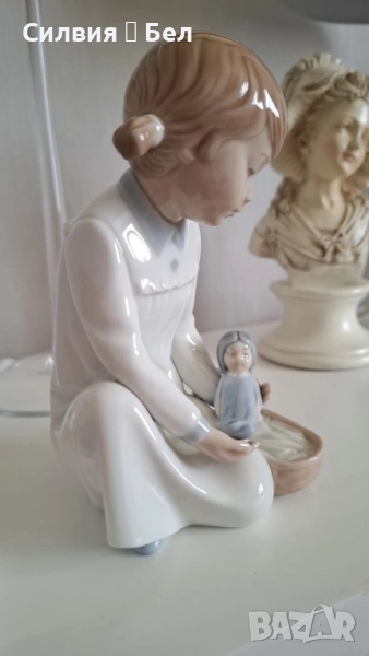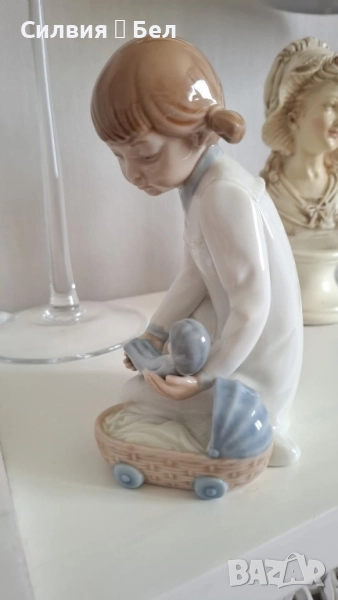 Порцеланова статуетка "Момиче с кукла" NAO от Lladro Порцеланова фигура "Момиче с кукла" – Nao by Lladro, Испания, 1977 г. Ръчно изработена. Представлява малко момиче, нежно поставящо кукла-бебе в малка количка. Изпълнена в типичните за Nao пастелни тонове – меко бяло, бледо синьо и кафеникаво за косата. Произведена в Испания, марка: Nao by Lladro Година на изработка: 1977 г. Височина: 16 см Материал: гланциран порцелан Стил: класически, нежен и емоционален дизайн, типичен за Lladro Прекрасен избор за колекционери или като винтидж декорация с емоционална стойност. Цена 1️⃣0️⃣0️⃣лв.•51,12 €✽✧✽•°”˜🦋”°•✽✧✽•°”˜🦋”°•✽✧✽•°”˜🦋”°•✽✧✽•°”🦋˜”°•✽✧