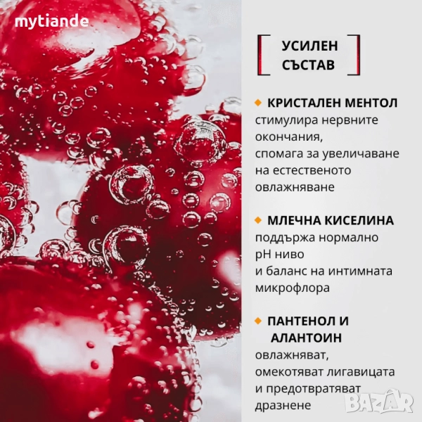 ❤️Действието на гела се основава на аминокиселината L-аргинин. Във Volupta+ от TianDe тя е представена за първи път в толкова висока доза. L-аргининът стартира процеса на производство на азотен оксид (NO) в организма, който разширява кръвоносните съдове, осигурявайки мощен кръвен поток към гениталиите. ❤️Редовната употреба на L-аргинина подобрява кръвообращението в тазовите органи, повишава тонуса на интимните мускули, което има благоприятен ефект върху организма. Ментолът в продукта засилва усвояването на аргинина, а също така стимулира нервните окончания, спомагайки за увеличаване на естественото смазване. ❤️Отличителна черта на гела Volupta+ на компания TianDe: поради наличието на млечна киселина в състава си, той се грижи за интимната микрофлора на лигавиците и поддържа нормално ниво на pH. Формулата на продукта е допълнена с пантенол и алантоин, които овлажняват, омекотяват лигавицата и предотвратяват раздразнения.
