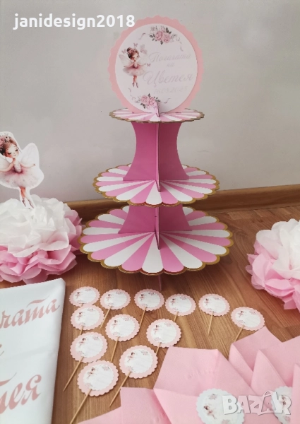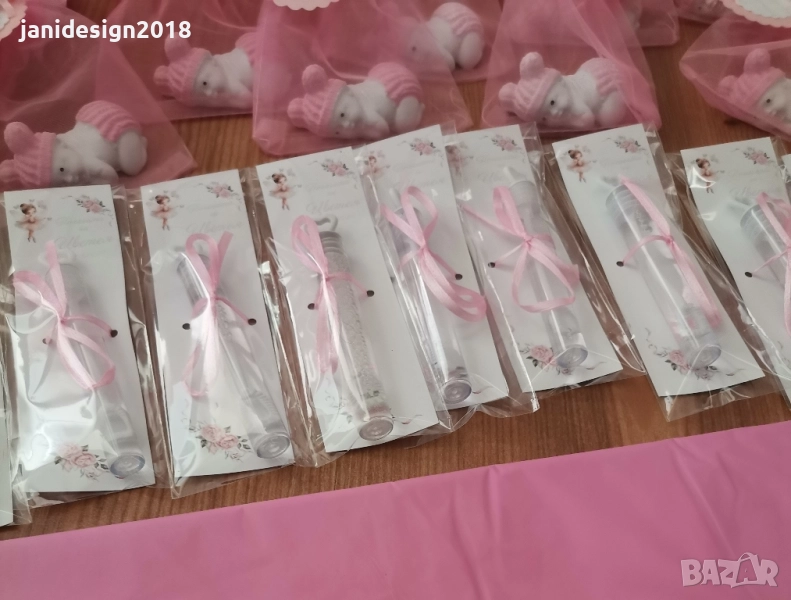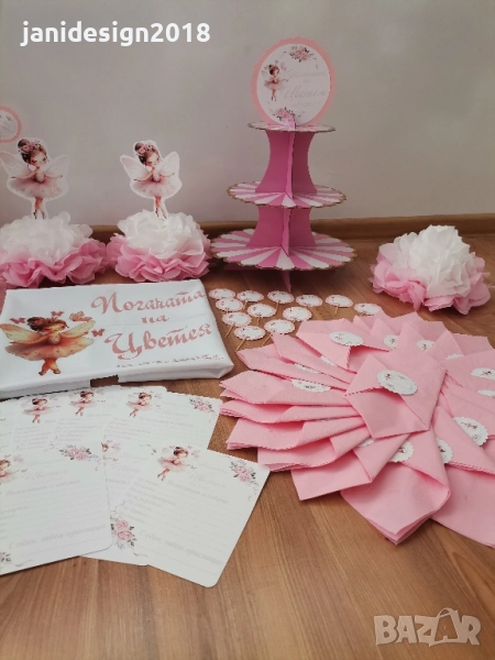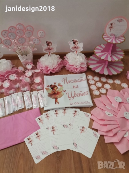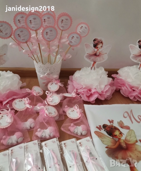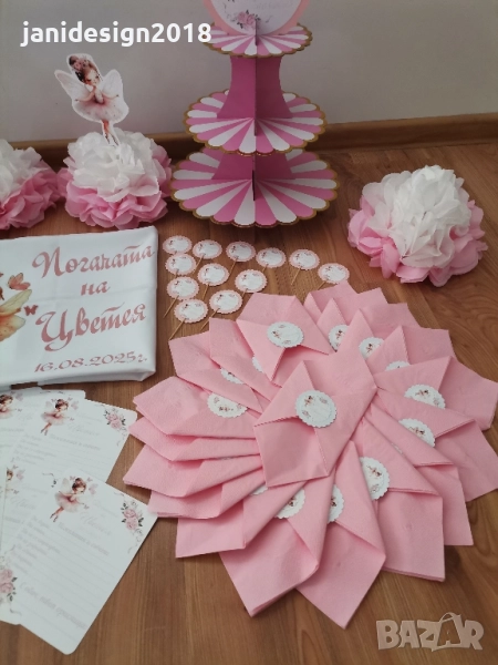 книга за пожелания с химикал * карти за пожеланията на орисниците * топки и цветя от тишу за украса * чаши, чинийки, вилички и сламки * покривка за маса * Салфетки боди/рокля/риза/едноцветни с декорация по темата * топери с пожелания за орисане на бебе кръгли или във форма на животни, със снимка на детето или с надпис по поръчка за украса или подаръчета за гостите *Украса За маса * стойка, формички и топери за мъфини *табела количка или бебешко шише * Покани * подаръчета за гостите