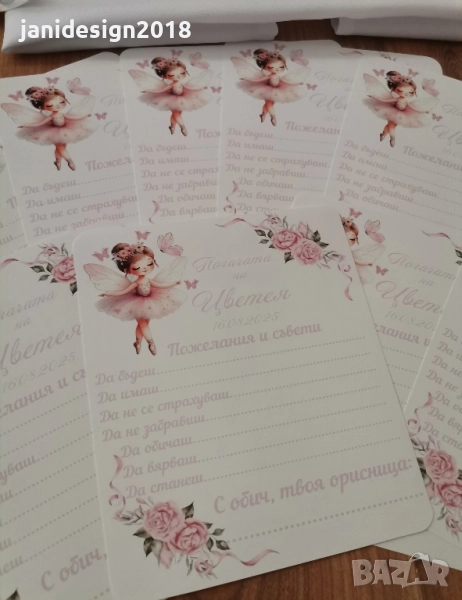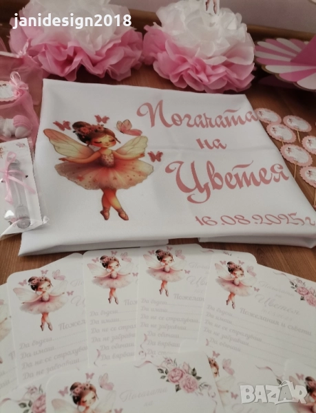 Украса За бебешка погача Всеки клиент сам избира какви аксесоари желае да включва украсата, както и нужната бройка. За повече информация Ви очакваме на лично съобщение. * надпис * Месал за разчупване на питката с името на детето и датата * малка кърпичка за паричките с име *боди с име и дизайн съобразен с темата на празника *бонбони с дизайн съобразен с темата на празника * рамка А4 формат с бебешка визитка или надпис по избор *