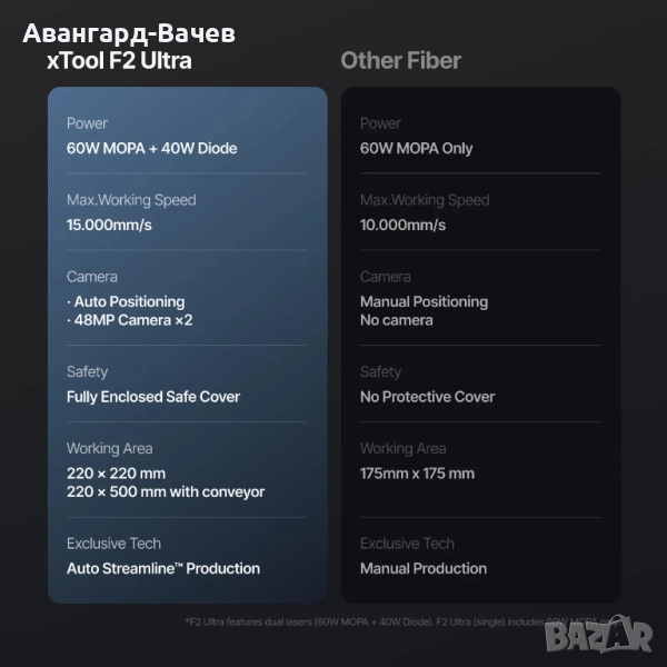месинг, неръждаема стомана и други. Ефективно партидно гравиране: площ 220 мм × 220 мм и скорост 15 000 мм/сек за професионално ниво на печат. Гарантирана безопасност: Затворен капак. Капак за защита на очите. Противопожарен стоп. Предварително плащане по банков път. Доставка до 10раб дни. Гаранция 24месеца. Предварително сглобен Да Да Вградена камера 48 MP двойни камери 16 MP интелигентна камера Метод на позициониране Позициониране на камерата Позициониране на камерата Режим на фокус Автофокус Автофокус Система за измерване на разстояние Няма данни Няма данни Метод за предварителен преглед Преглед на интелигентната камера Преглед на интелигентната камера Размер на лазерното петно 0,09*0,1 мм (40W диоден лазер) 0,03*0,03 мм (60W MOPA лазер) 0,08*0,1 мм (20W диоден лазер) 0,03*0,03 мм (20W фибърен лазер) Прецизност на позициониране 0,2 мм Няма данни Прецизност на измерване на обхват 0,2 мм, Камера 0,5 мм, Камера Разделителна способност на изображението Няма данни Няма данни Точност на движението 0,00482 мм 0,00482 мм Обща информация Сертификация за безопасност Лазерна безопасност клас 4 Лазерна безопасност клас 4 Размер на продукта 294 мм x 429 мм x 521 мм 273 мм × 373 мм × 492 мм Тегло на продукта F2 Ултра: 21,6 кг F2 Ultra (единичен): 20,8 кг 14,7 кг Максимална входна мощност на машината 400W 250 W - 275 W Входно напрежение на захранващия адаптер 220 V - 240 V, променлив ток 50/60 Hz 100 V - 240 V, променлив ток 50/60 Hz
