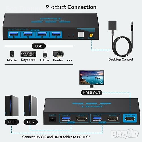 Нов Превключвател HDMI KVM 2 PC 1 монитор с USB 3.0 и кабелен контролер