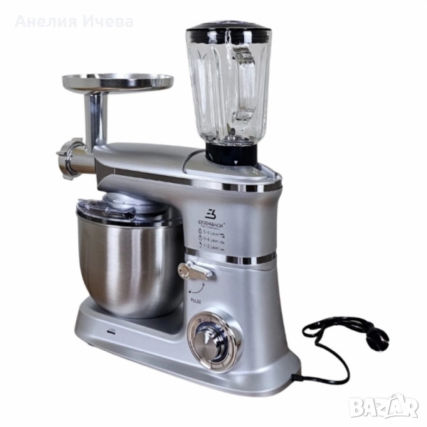 Приставки: кука за тесто, бъркалка за кремове, телена бъркалка, месомелачка + 2 диска, приставка за колбаси, шпатула, тласкач;