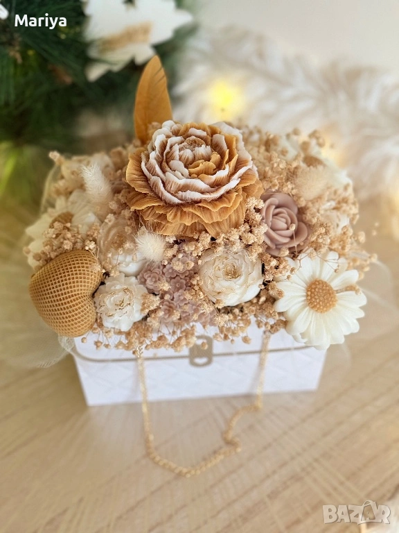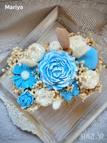 Букет с цветя от соев восък с аромат в син цвят в чантичка → Обява 51642076