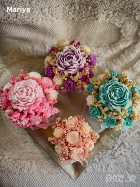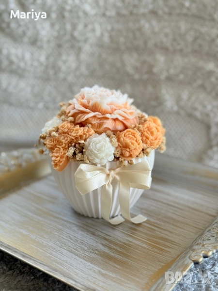 Букети с цветя от соев восък с аромат в Бяла кашпа → Обява 51642114