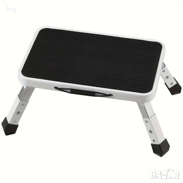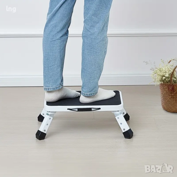 Безопасен дизайн: Платформата е с неплъзгаща се повърхност, а гумените капачки на крачетата осигуряват отлично сцепление, дори на мокри повърхности. Заоблените ъгли предпазват от наранявания.