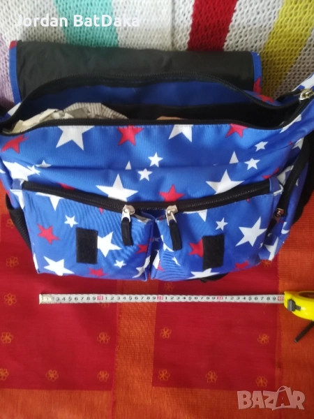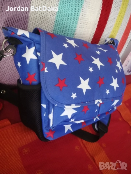 Много готина чанта, напомняща за цветовете и звездите на Converse. Удобна с централна част с цип и вътрешен джоб. Външните също удобни за ключове, телефон, дреболии. Размери - 40/30, по ниска, но става за лаптоп. Много свежа чанта, препоръчвам!
