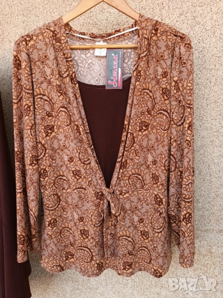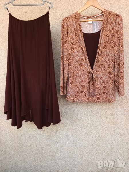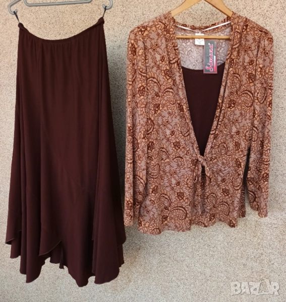 Трикотажен еластичен костюм с дълъг ръкав, в гама светлокафяво цветно и тъмно кафява пола. Вътрешна част на блузата в тъмнокафяво, номер 56.