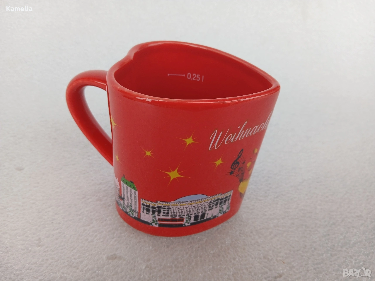 Колекционерска чаша от коледен базар във Виена, отличаваща се със своята специфична форма на сърце. Нова. 250ml.