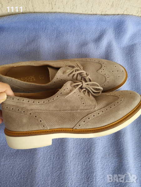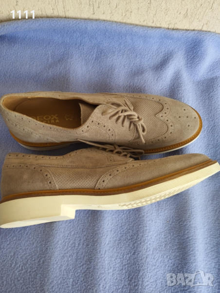 Обувките са обувани един път за проба.Бежов цвят.Естествен велур.Марка Geox.Номер 43 и 1/2 с дължина на стелката 28см.Цена 85лв.