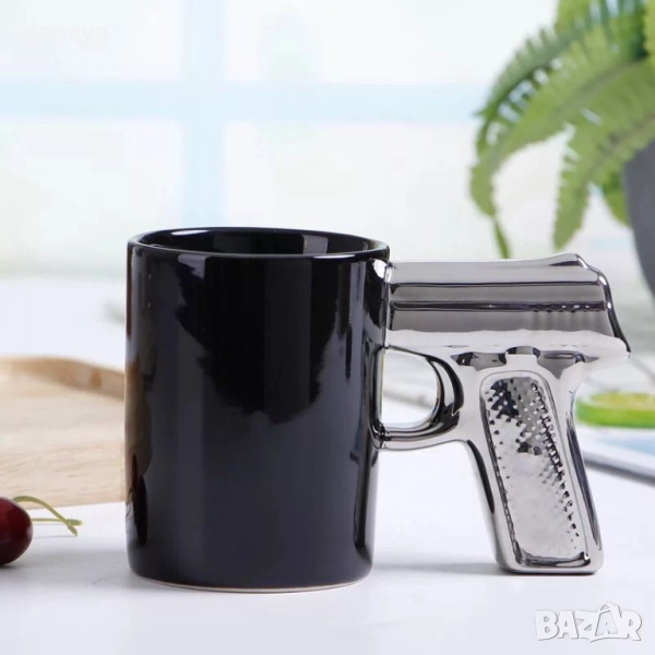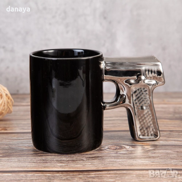 Черна чаша с дръжка с форма на пистолет. Забавна чаша, нестандартен подарък за него! Чудесна идея за