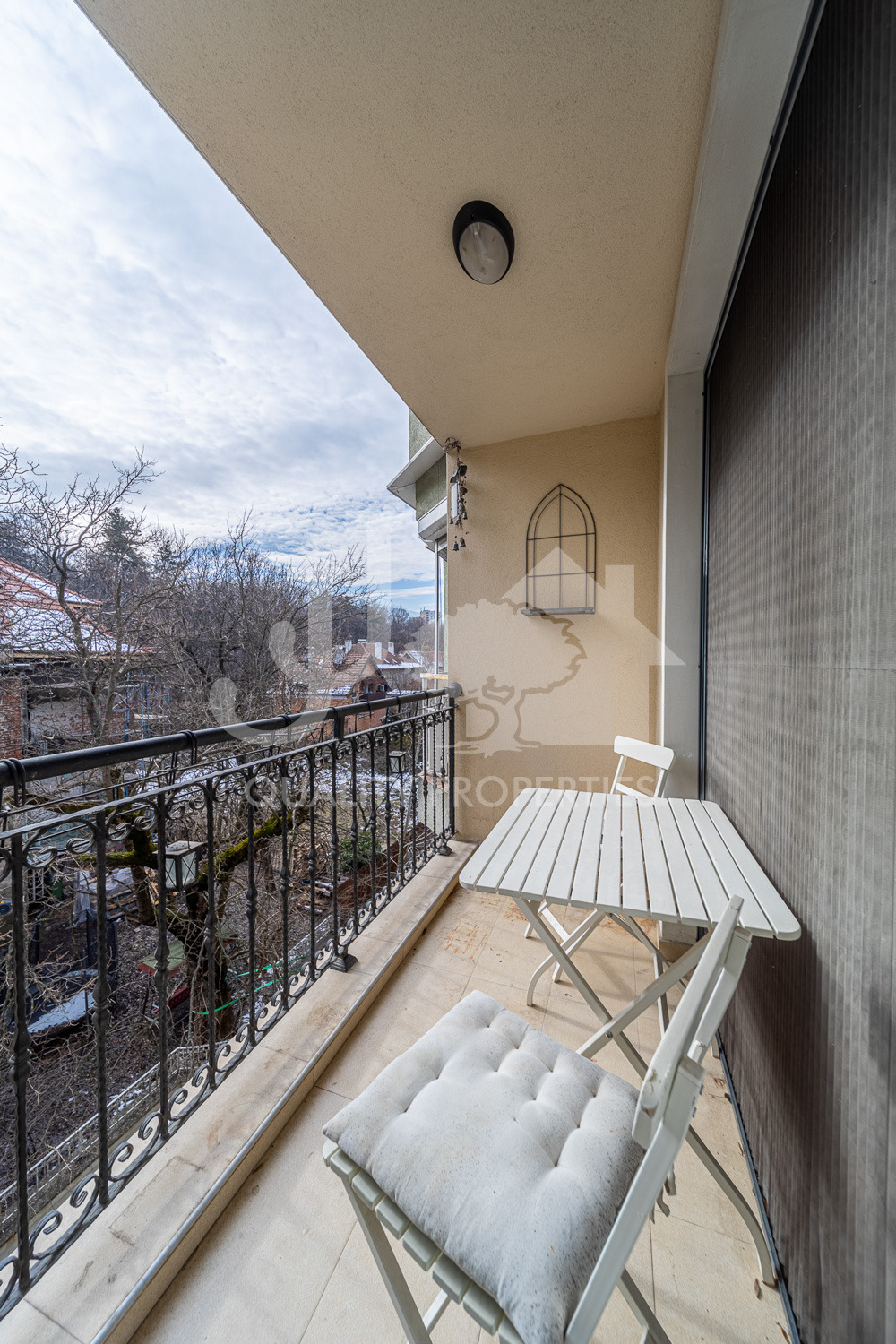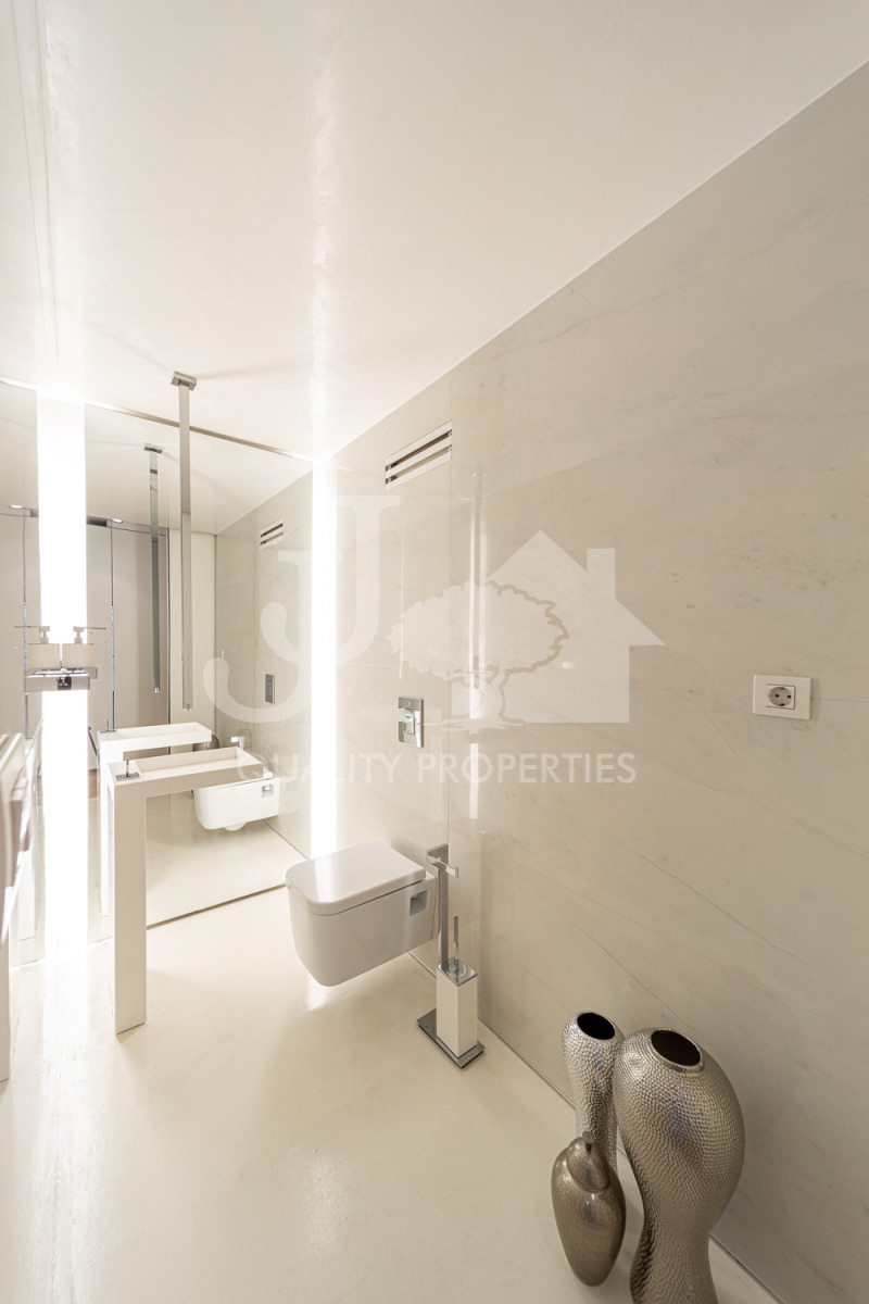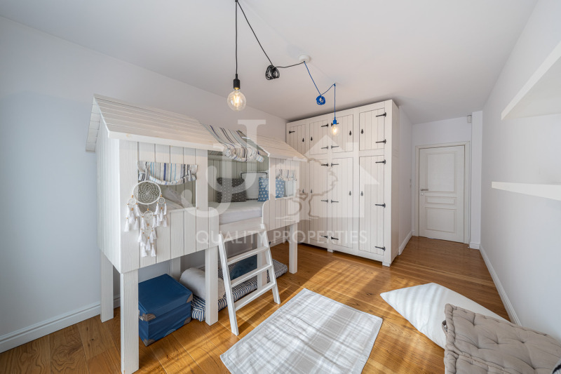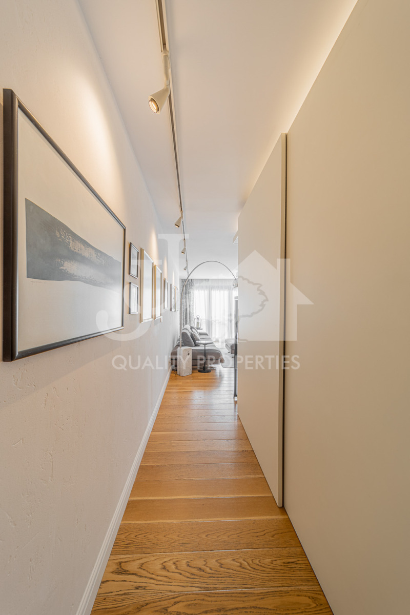 Разпределение: вх. антре с вградени гардероби, великолепна дневна обособена на зони- холна част, трапезария и елегантна вградена кухня с уреди Miele, родителска спалня с голяма баня с тоалетна и гардеробна стая, още две спални, втора баня с тоалетна, отделно тоалетна за гости, мокро помещение и три тераси. Отоплението и охлаждането в имотът е подово, посредством нова термопомпа.